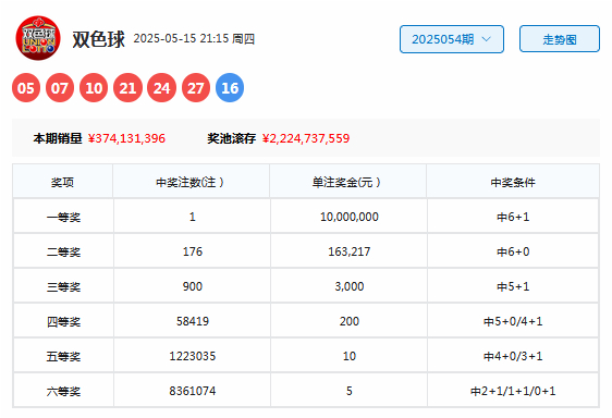 双色球第2025054期开出奖号为05、07、10、21、24、27+16。其中红球奇偶比为4:2,三区比为3:1:2,大小比为3:3,蓝球开出大号16。